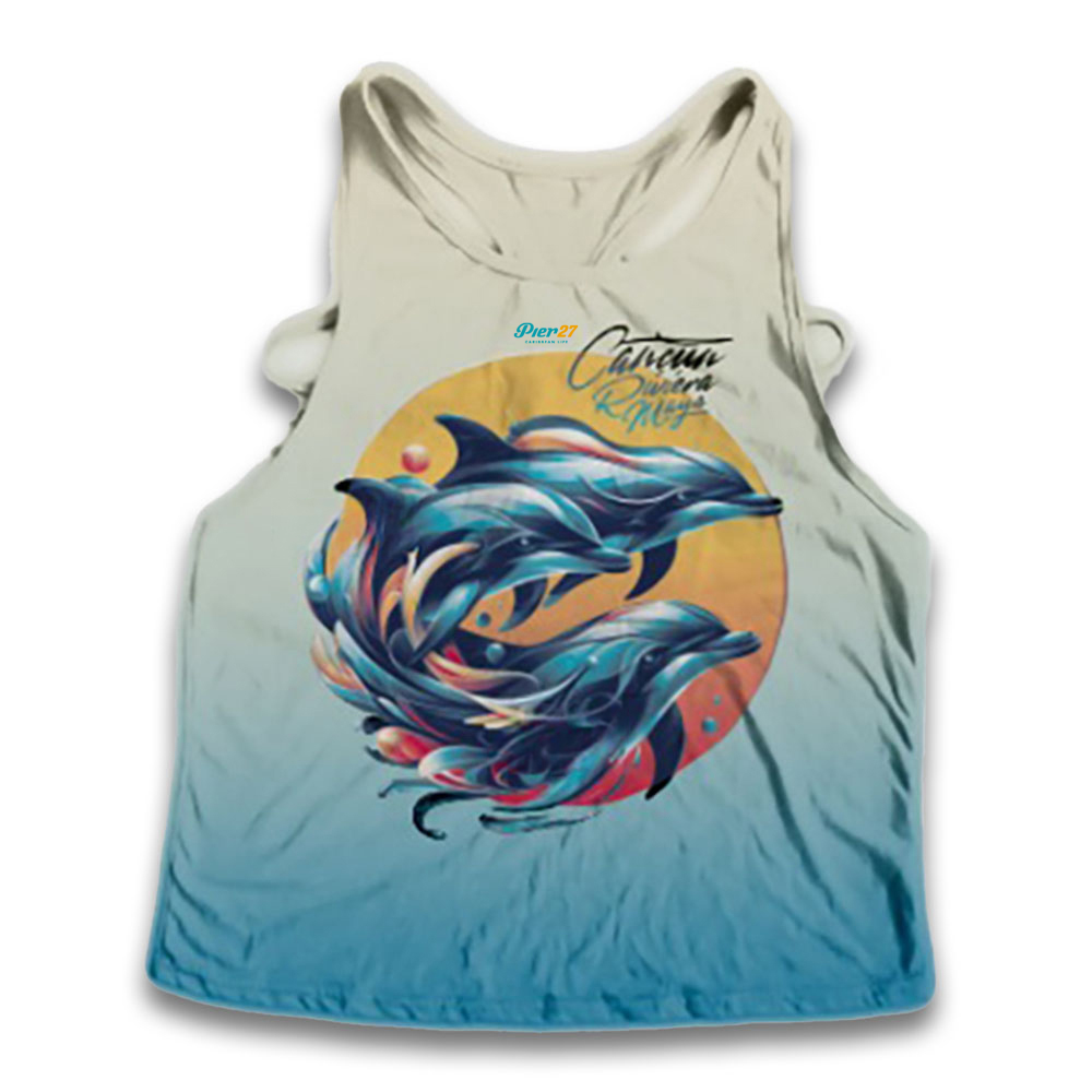 This vibrant women’s tank top features a captivating design of stylized dolphins swimming against a gradient background.
