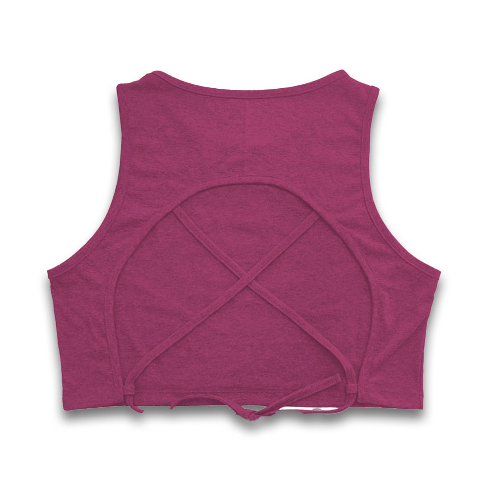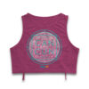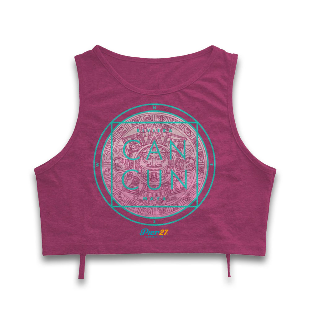 Vibrant purple crop tank top featuring a stylized Aztec calendar design in teal and pink