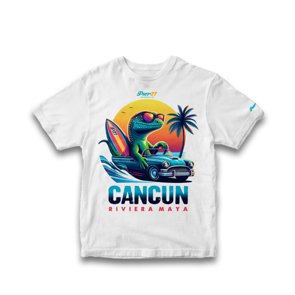 White t-shirt featuring a vibrant graphic of a cool iguana driving a vintage car with a surfboard.